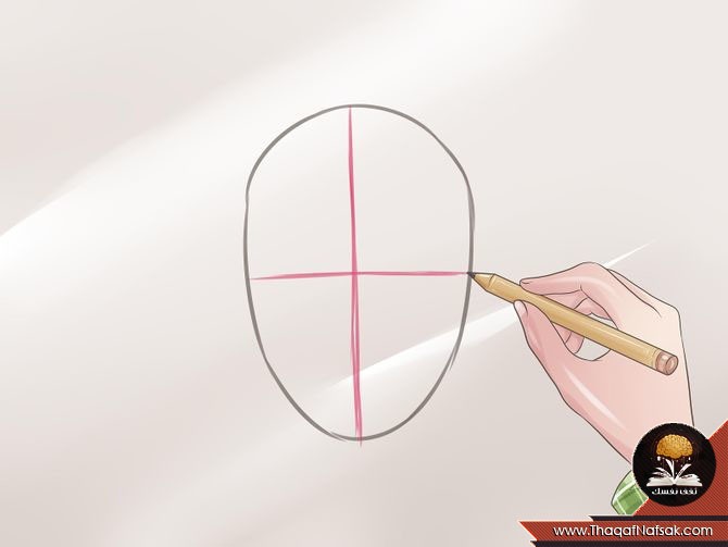 2. إضافة خطوط التقسيم الفاصلة : وهذه هي أسهل طريقة عند رسم الوجه فهي تساعد علي تقسيم الوجه إلي نسب متساوية .قم برسم خط في منتصف الشكل البيضاوي بالعرض ثم رسم خط أخر في المنتصف بالطول .